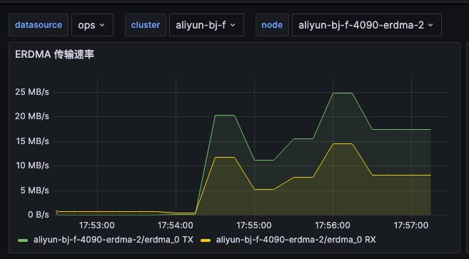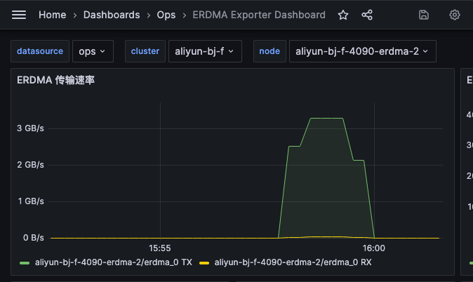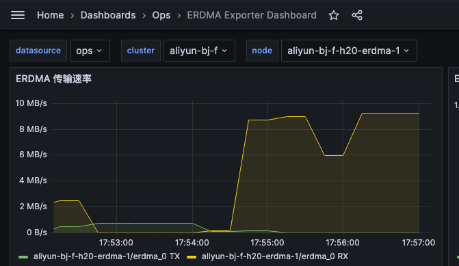 为了能图标查看 eRDMA 的性能,我写了个 eRDMA exporter,https://github.com/shaowenchen/erdma-exporter 导入面板可以查看这样的图表: